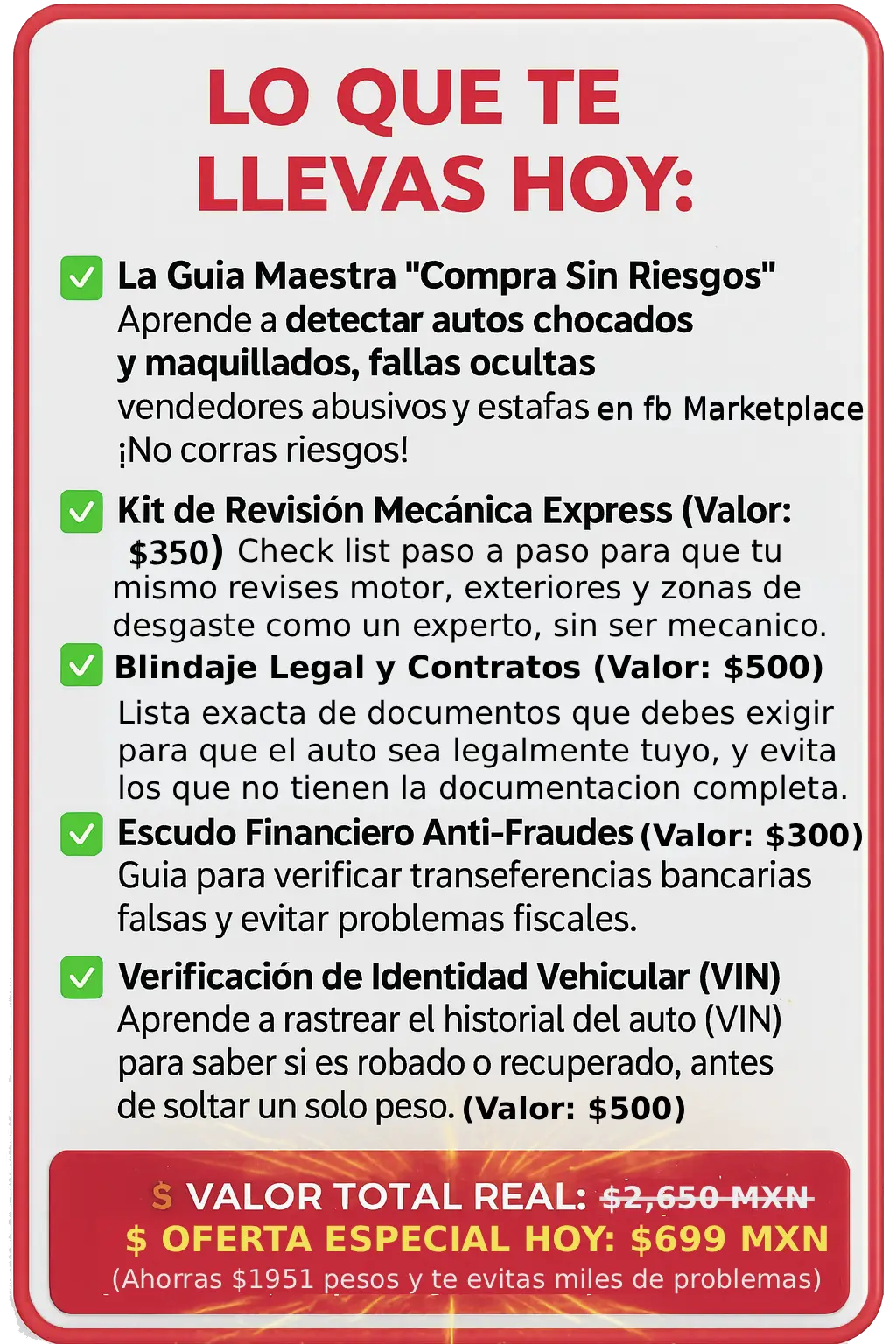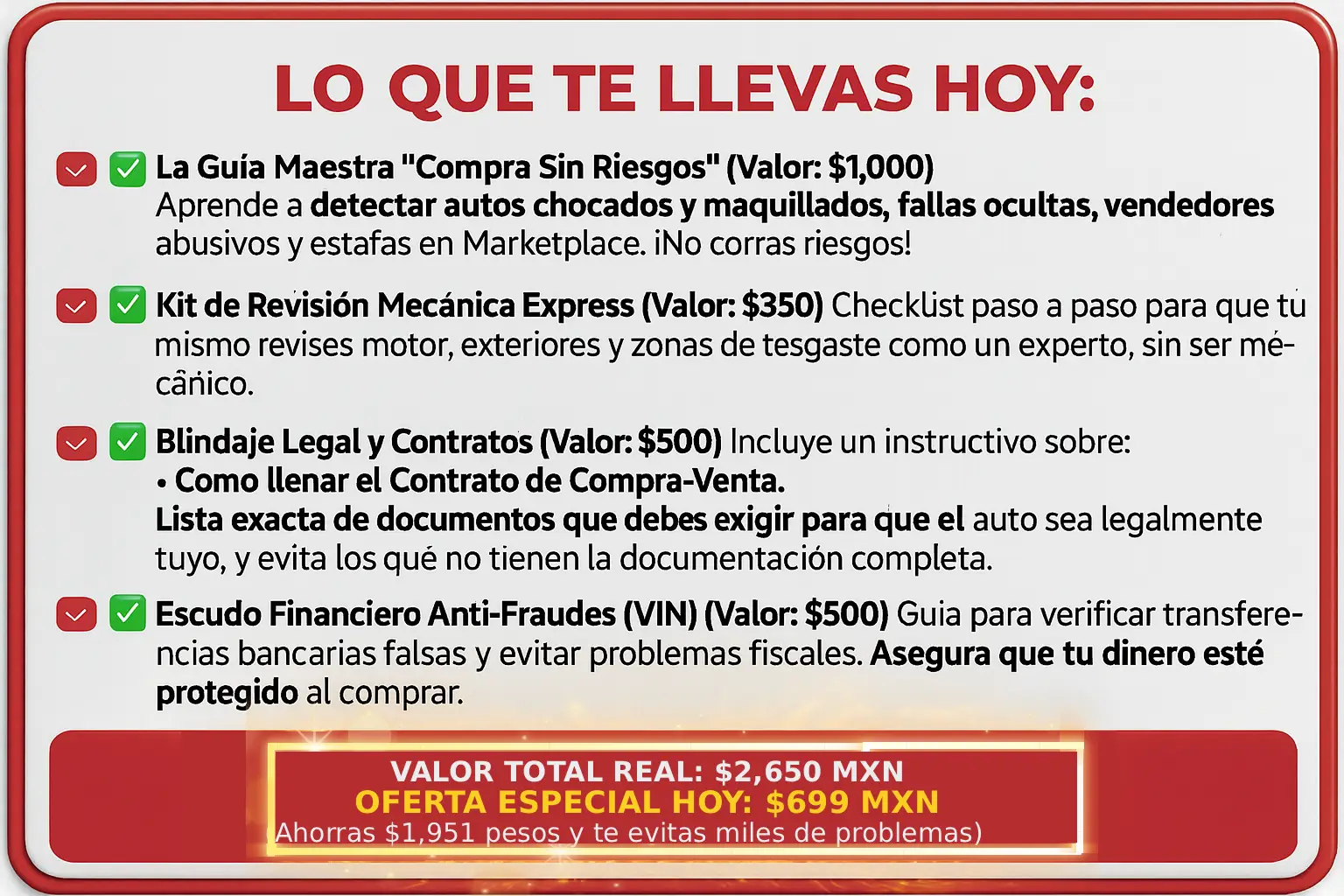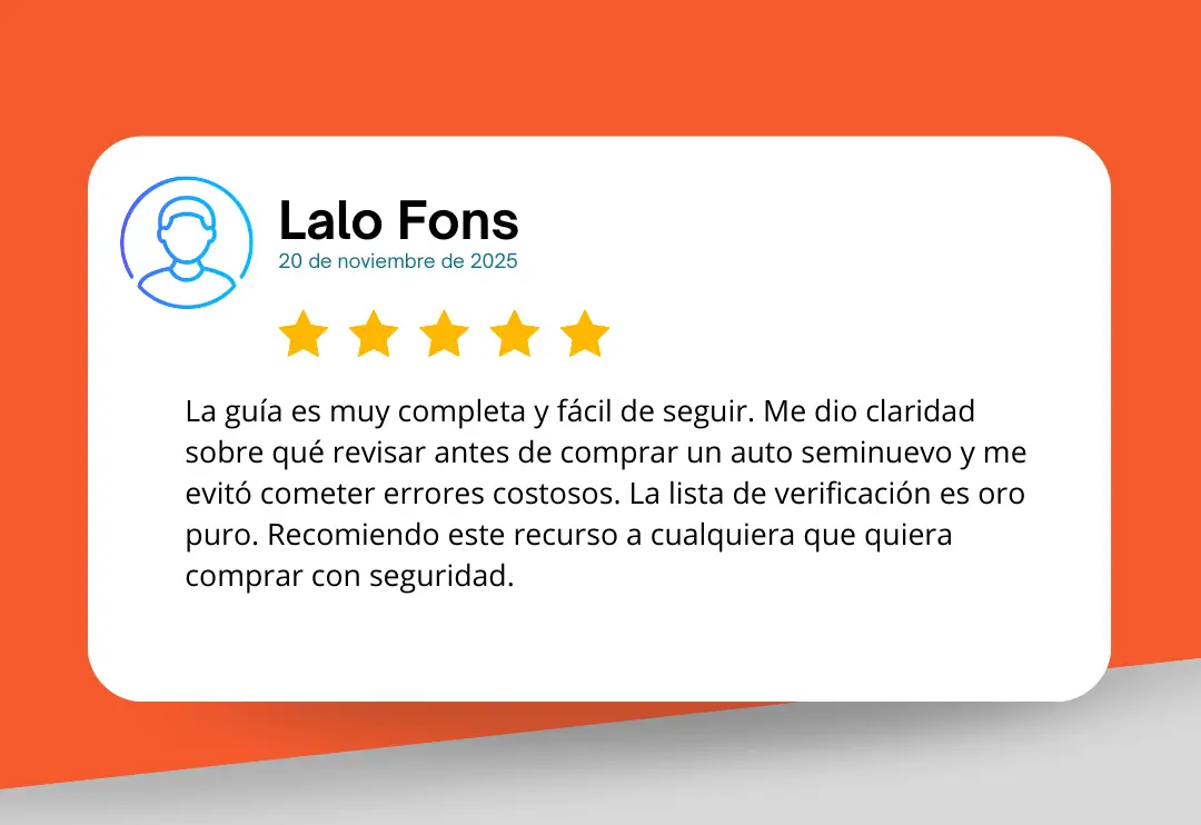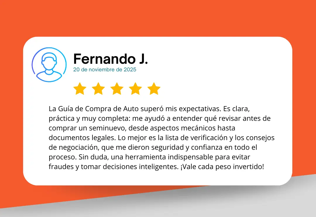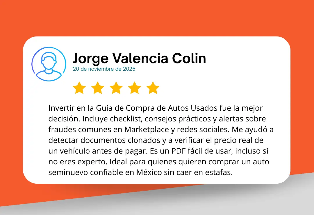 ¿Vas a comprar en los próximos meses? ⚠️ Revisa el comportamiento de precios de los vehículos usados y seminuevos. ¡Desde hoy y negocia el mejor precio en los próximas semanas!¿Porqué comprar la Guía de Compra? ⚠️ ¿Que es lo primero que tienes que preguntar al buscar por marketplace, agencia, familiar/amigo, particular, etc.?⚠️ ¿Cual es el documento que mas te conviene al comprar; facturas original, refactura, fac. endosada, fac. digital.?⚠️ Ya hay agencias de autos fraudulentas que engañan al comprador identifica cuales tienen procesos legales.⚠️ Identificación Legal y Fraudes Documentales⚠️ Inspección Física y Mecánica Experta⚠️ Financiamiento y Precios de Mercado⚠️ Mantenimiento y Desgaste de un Vehículo⚠️ Como saber si un auto es bueno, malo, regular⚠️ Alertas Clave (Red Flags y Green Flags)⚠️ Revisión en Fuentes Oficiales⚠️ Transacción Segura y Puntos Rojos⚠️ Revisión en Fuentes Informativas